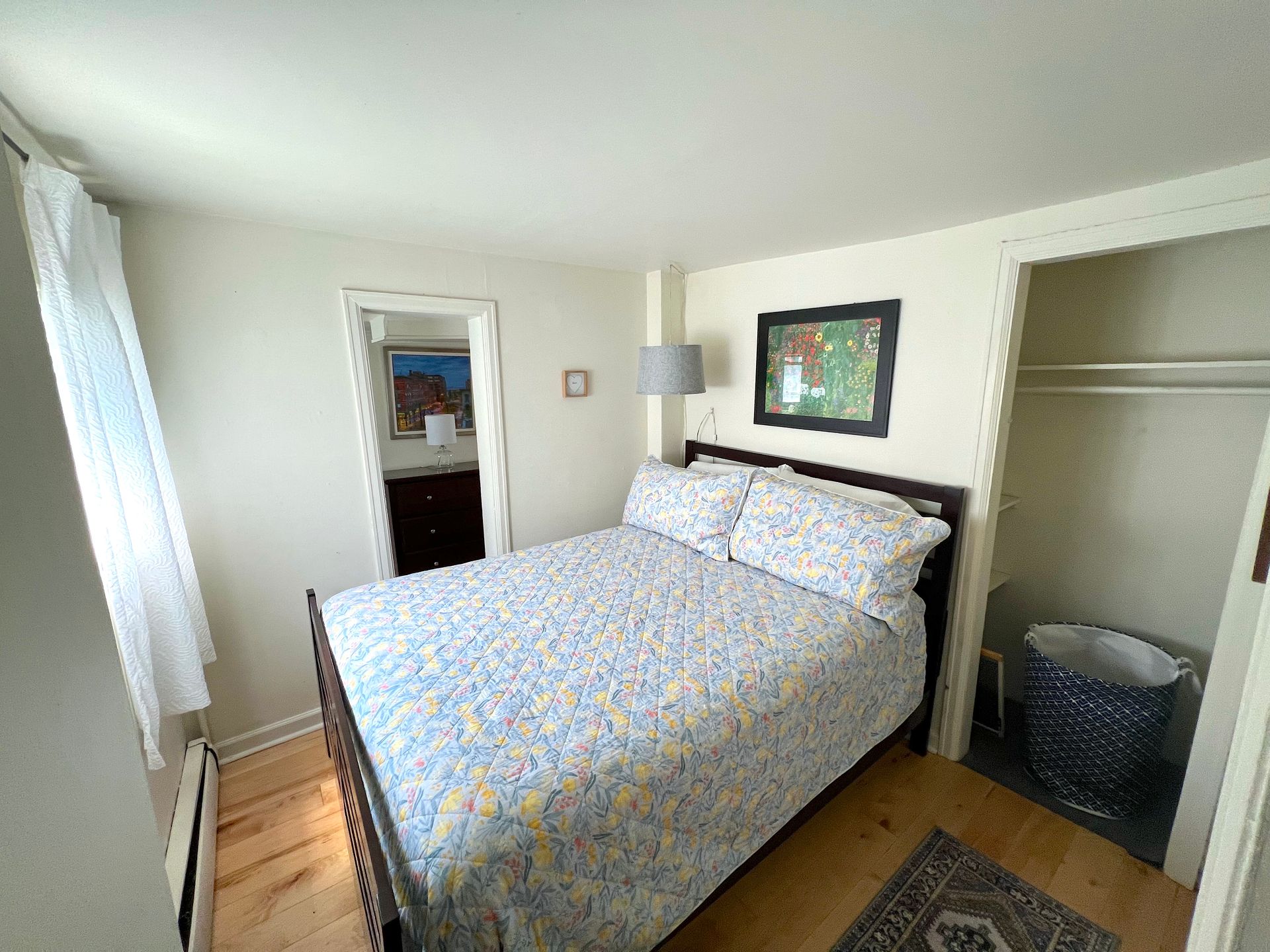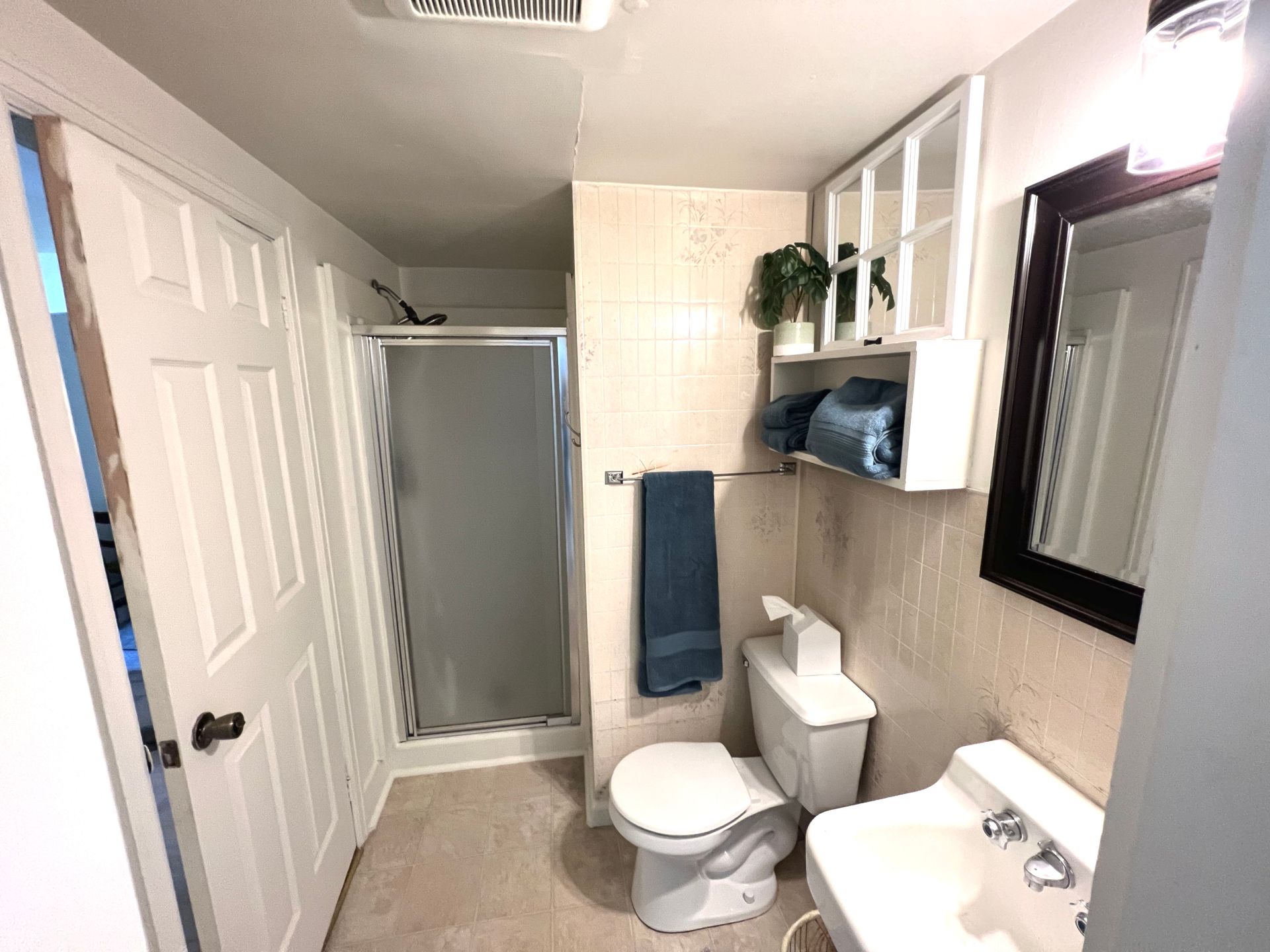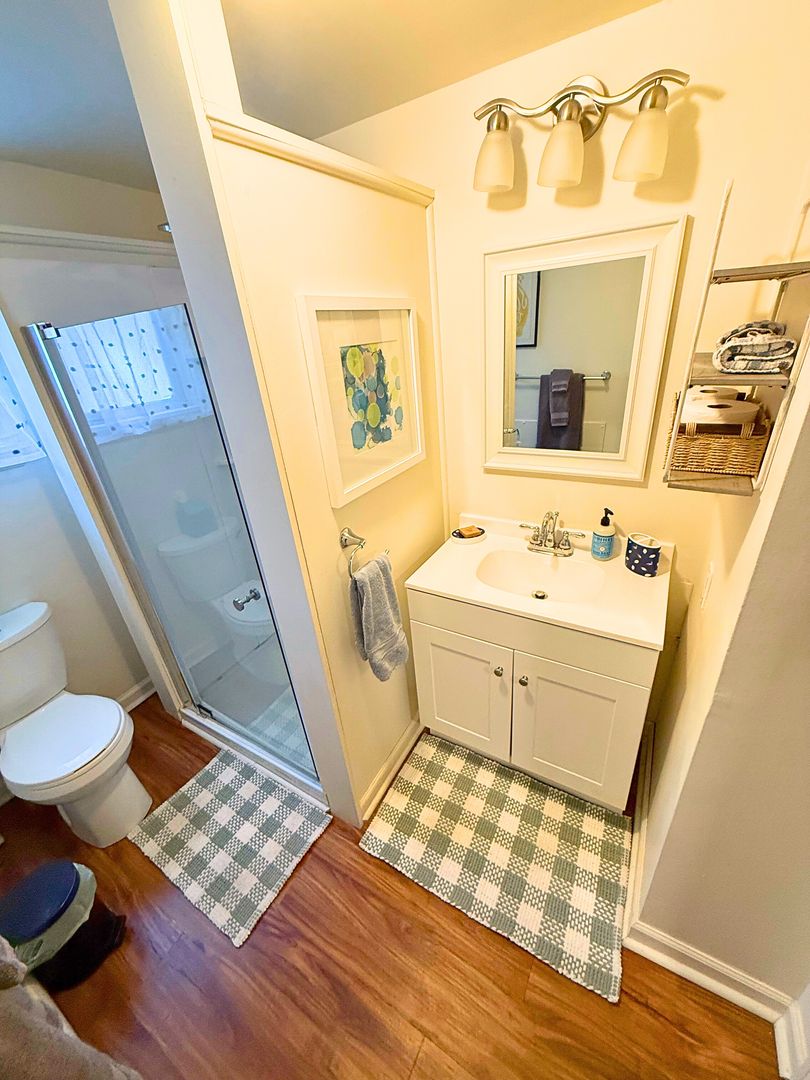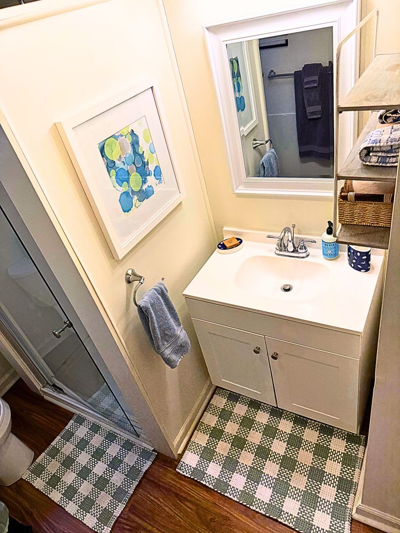 The private bedroom includes comfortable bedding, fresh linens, and ample storage. A clean, modern bathroom with a walk-in shower and towels completes the space. High-speed Wi-Fi and a quiet residential setting make this apartment perfect for working professionals.
